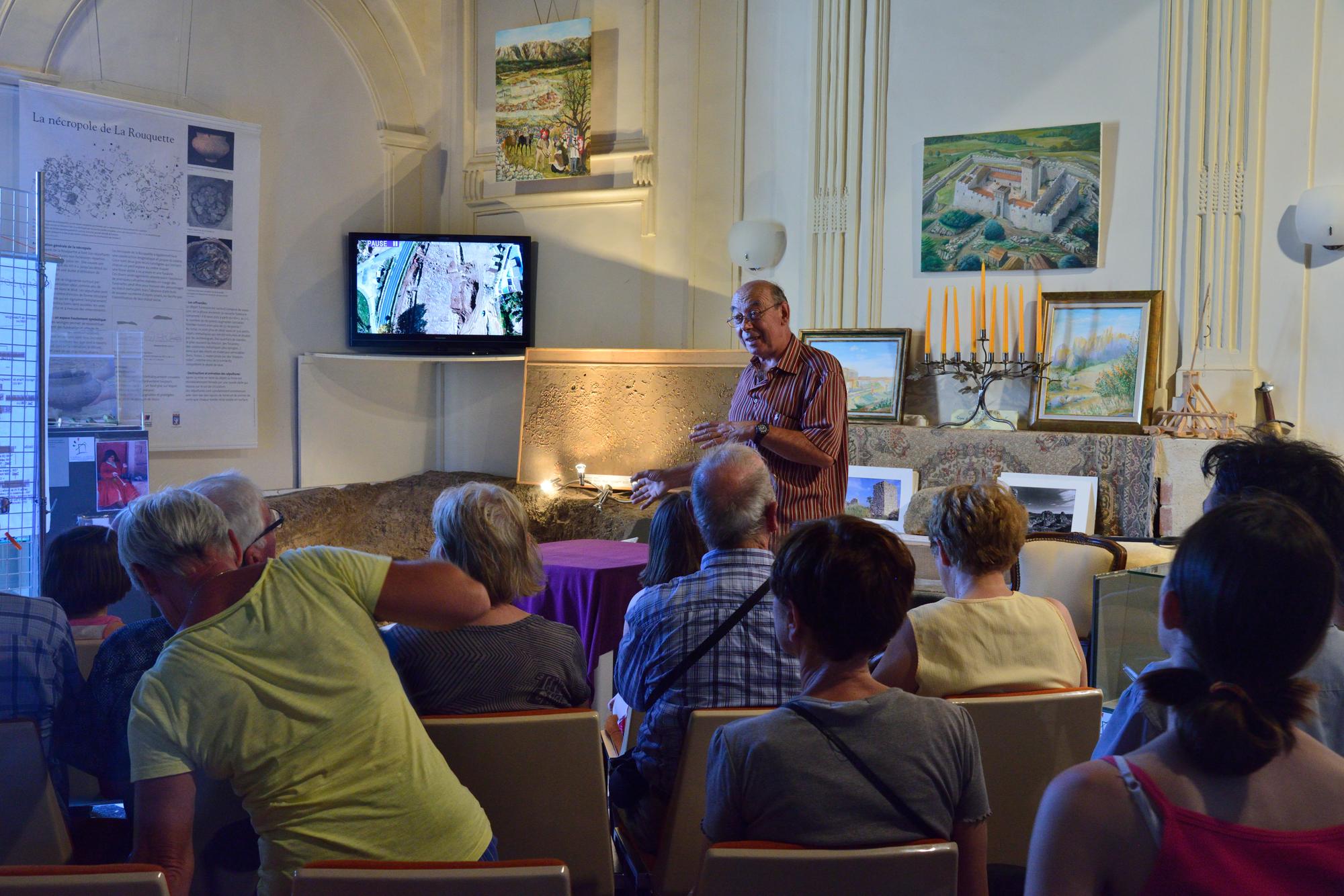 La visite s’est terminée à l’intérieur du château, où M. Jacques Chabbert nous a présenté une première vidéo sur la nécropole de la Rouquette (220 tombes à incinération des VIIIe-VIe siècle avant notre ère qui ont livré un important mobilier) et une deuxième vidéo sur les très beaux plafonds peints du XVe siècle qui ont été découverts en 2011 dans un édifice promis à la démolition.
