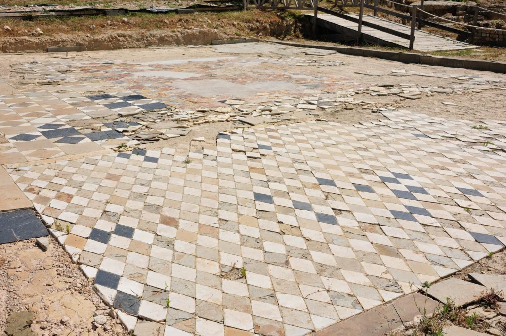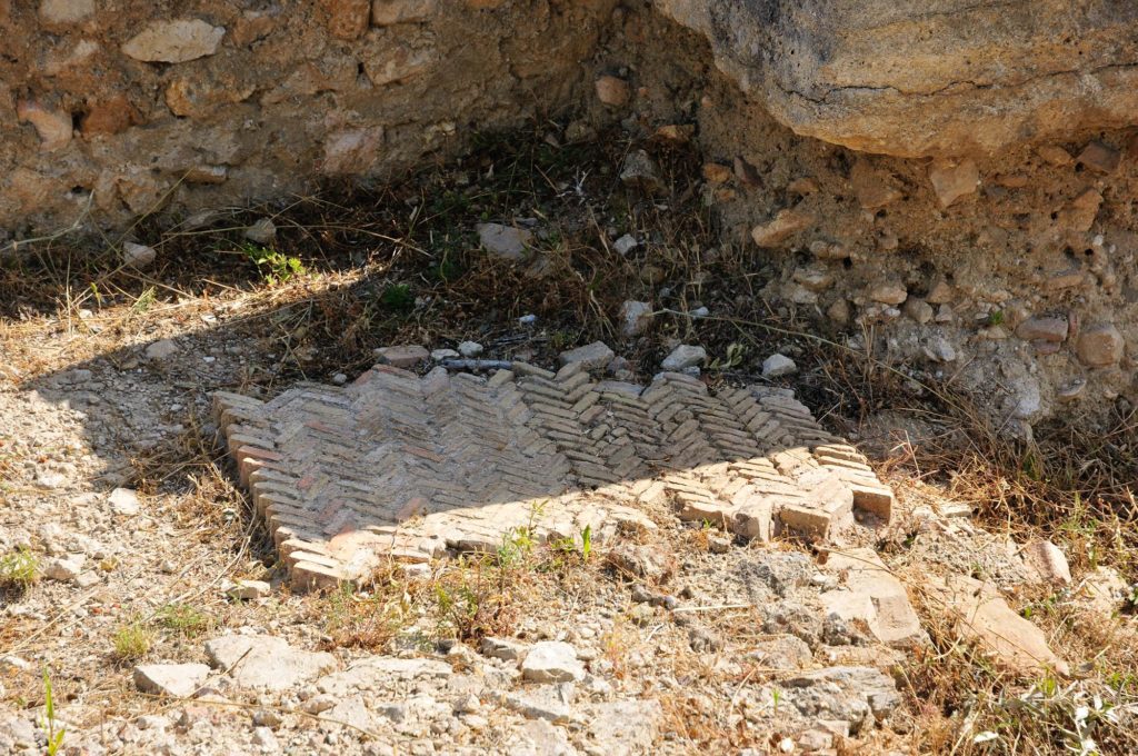Un rare pavage polychrome orne l’entrée des thermes.